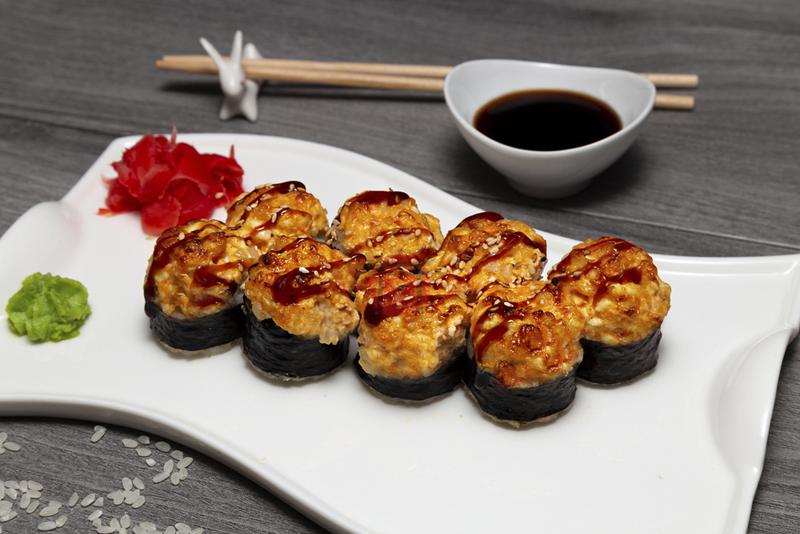 Состав: Сливочный сыр, авокадо, тигровые креветки, кальмар, соус для запекания, унаги соус, кунжут.